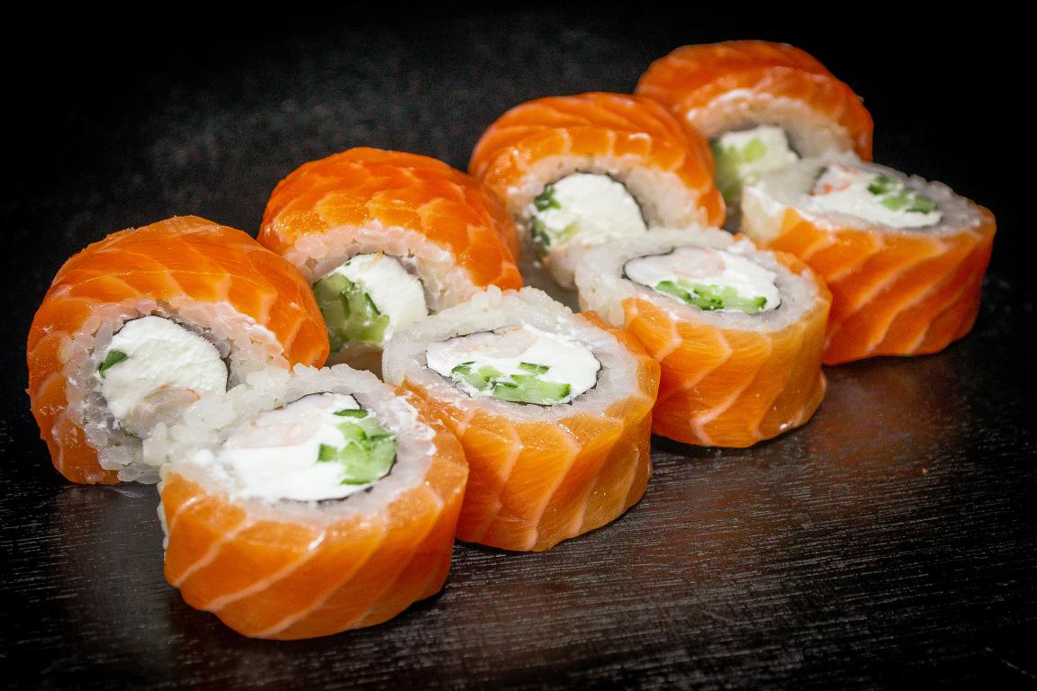 Это самый известный и любимый рецепт многих поклонников японской кухни. Универсальность обеспечивает и внешний вид — кусочек выглядит как рис, завёрнутый в водоросли, а поверх него находится красная рыба. Иногда Филадельфию украшают красной икрой или тобико.